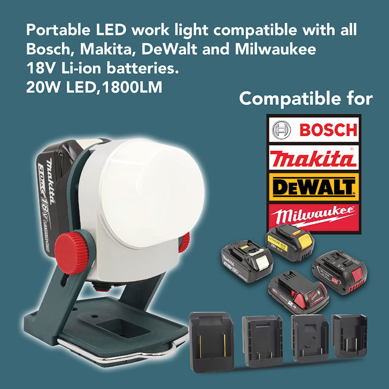 In der Grundausführung können die Akkus von Makita an die Arbeitsleuchte angesteckt werden während über einen Adapter dann auch folgende Markenakkust mit 18V Spannung an die @LED Arbeitsleuchte adaptiert werden können: